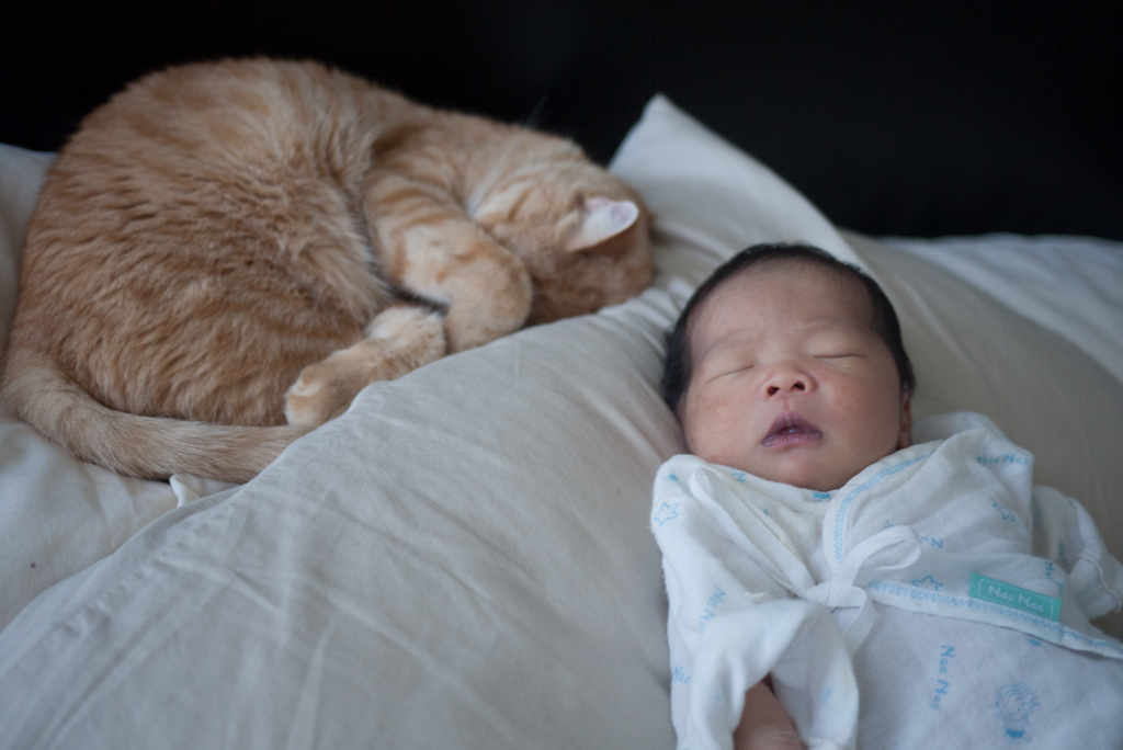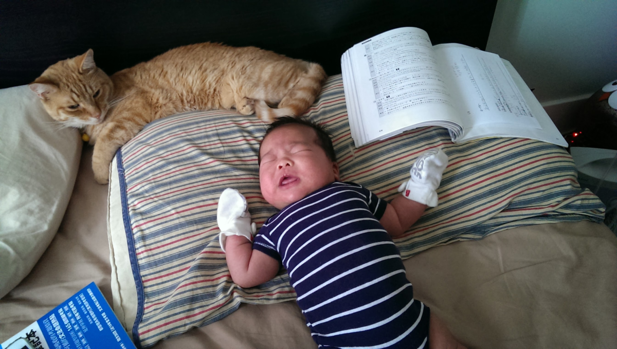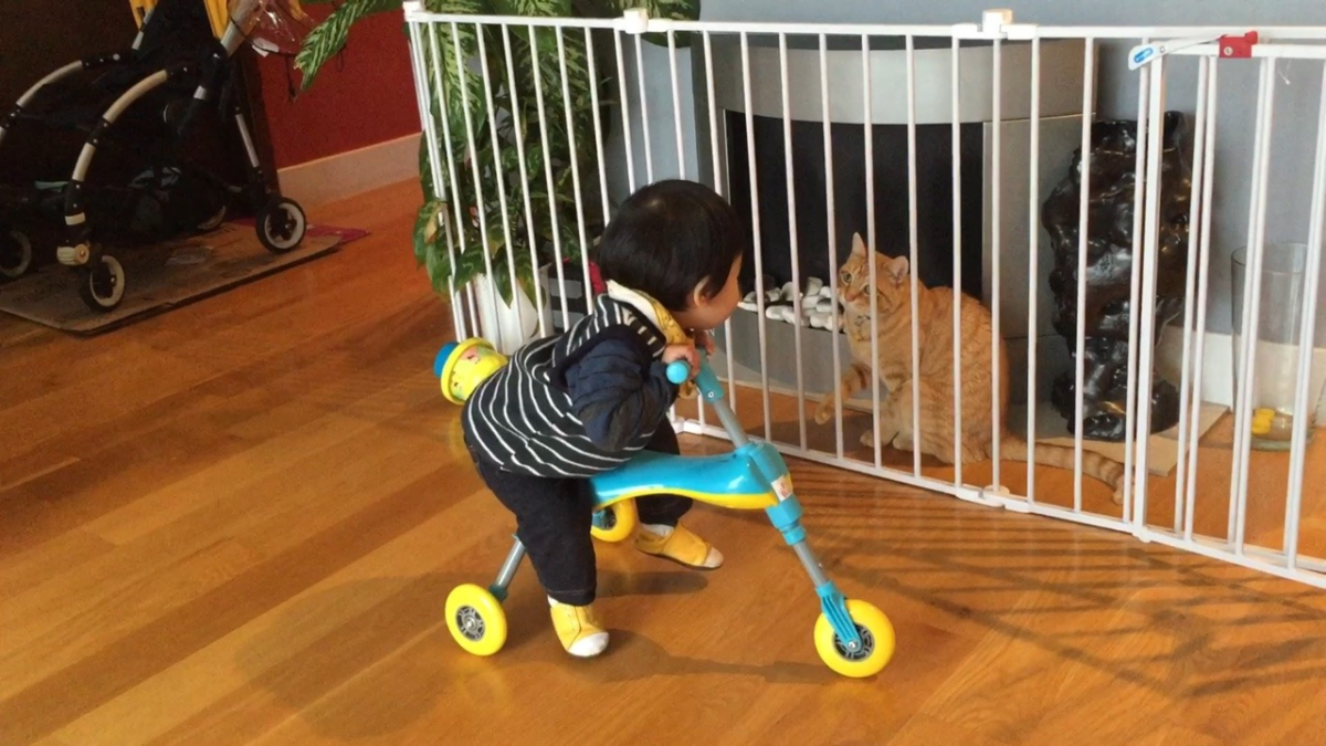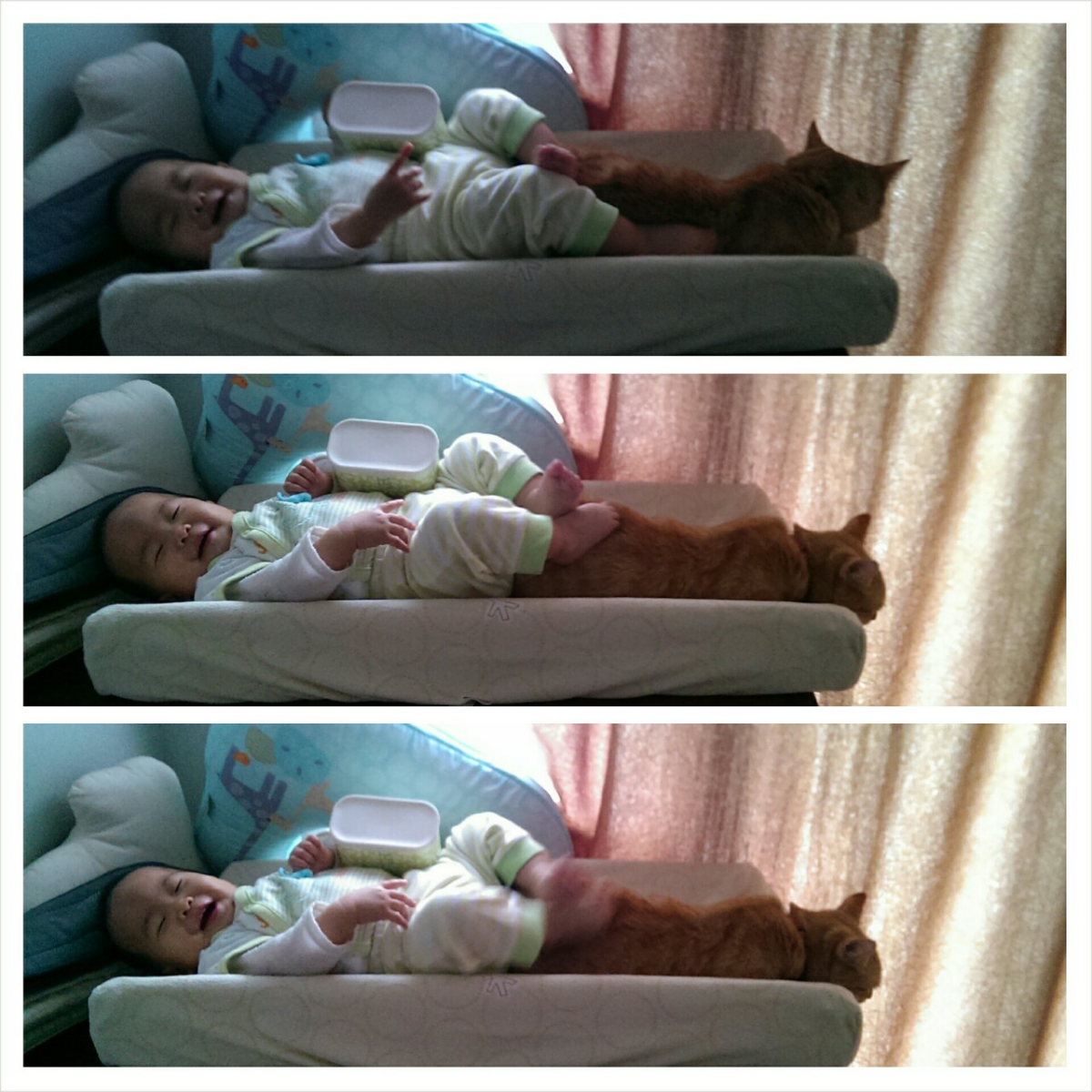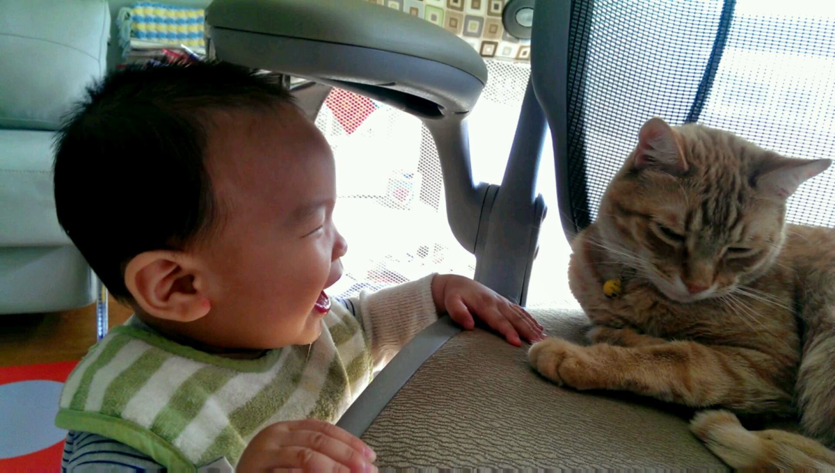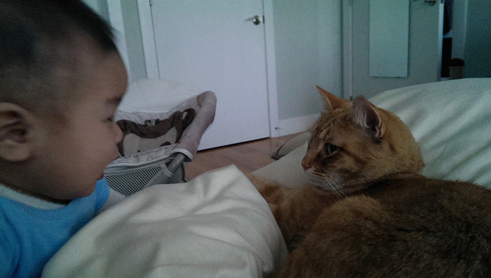 元元第一天回家的那天,柯南吃飯頻頻回頭看這傢伙有沒有要來「搶飯碗」。發現這傢伙還不會移動之後才安心。